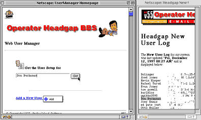 I occasionally have trouble remembering where I keep the different logs and what I named them. I though it would be a good idea to consolidate the logs and other administrative functions into one web accessible screen. I put them all on one main page and placed a bookmark in my browser (Netscape). These pages are rough and inconsistent (quick & dirty?). I would like for others to use and improve them and hopefully send me back what improvements you make. I am no expert.