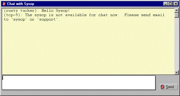 To send a message, type text into the window. All typed characters will appear in the lower half of the window. Click in the "Send" button to send the text. Your message will appear in the upper half of the message, just as the Sysop will see it. If the Sysop is available, anything typed by the Sysop will also appear in the upper half of the window.